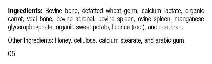 Cada porción (1 tableta) contiene: Ingredientes: Hueso bovino, germen de trigo desgrasado, lactato de calcio, zanahoria orgánica, hueso de ternera, glándula suprarrenal bovina, bazo bovino, bazo ovino, glicerofosfato de manganeso, batata orgánica, regaliz (raíz) y salvado de arroz. Otros ingredientes: Miel, celulosa, estearato de calcio y goma arábiga.